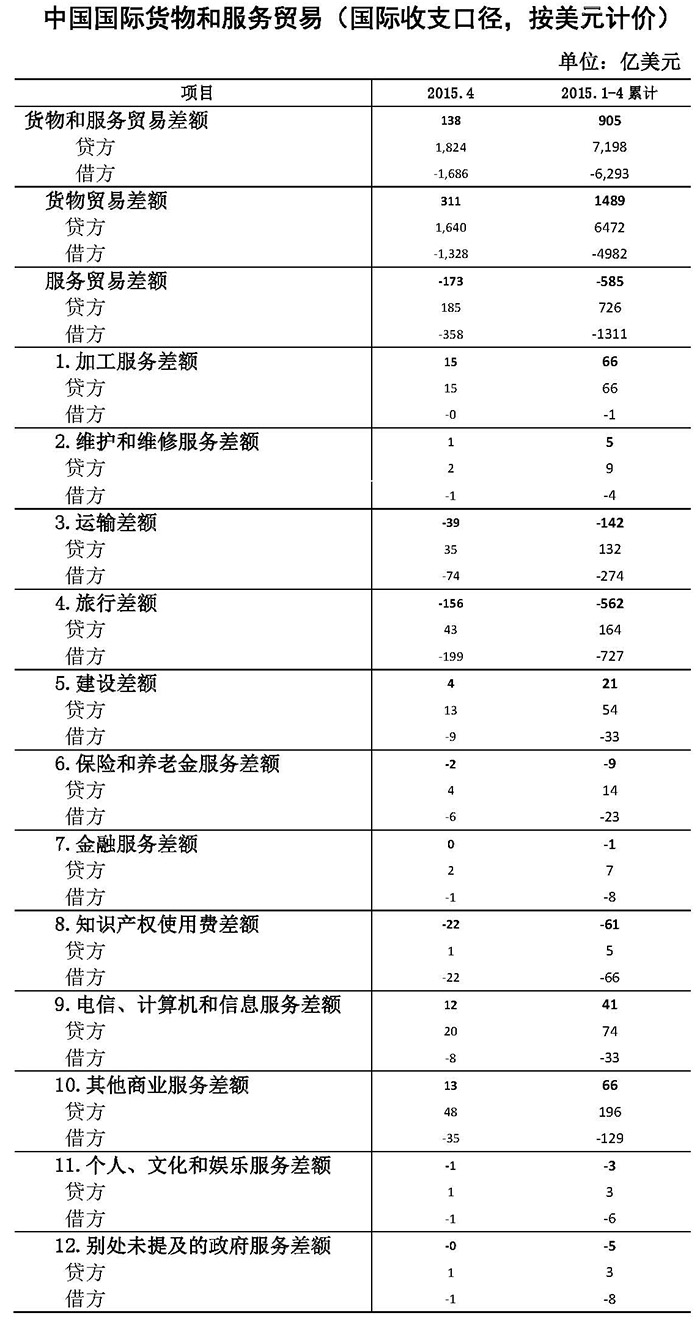 ????????按美元計價,2015年4月,我國國際收支口徑的國際貨物和服務(wù)貿(mào)易收入1824億美元,支出1686億美元,順差138億美元。其中,貨物貿(mào)易收入1640億美元,支出1328億美元,順差311億美元;服務(wù)貿(mào)易收入185億美元,支出358億美元,逆差173億美元。