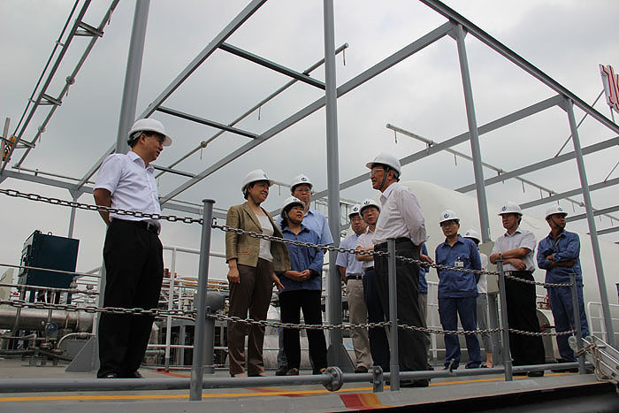 ????????在現(xiàn)場(chǎng),林敏總經(jīng)理向張主任詳細(xì)介紹了全國(guó)首個(gè)水上LNG加注站-“海港星01號(hào)”近一年的技術(shù)攻關(guān)和建設(shè)情況。張主任和陳局長(zhǎng)仔細(xì)聆聽并不時(shí)就設(shè)備及系統(tǒng)運(yùn)行狀況與現(xiàn)場(chǎng)人員進(jìn)行交流,對(duì)海企港華的創(chuàng)新精神進(jìn)行了充分肯定,對(duì)加注站的建設(shè)水準(zhǔn)給予了高度評(píng)價(jià),并對(duì)加注站將于26號(hào)投入試運(yùn)行表示熱烈祝賀。