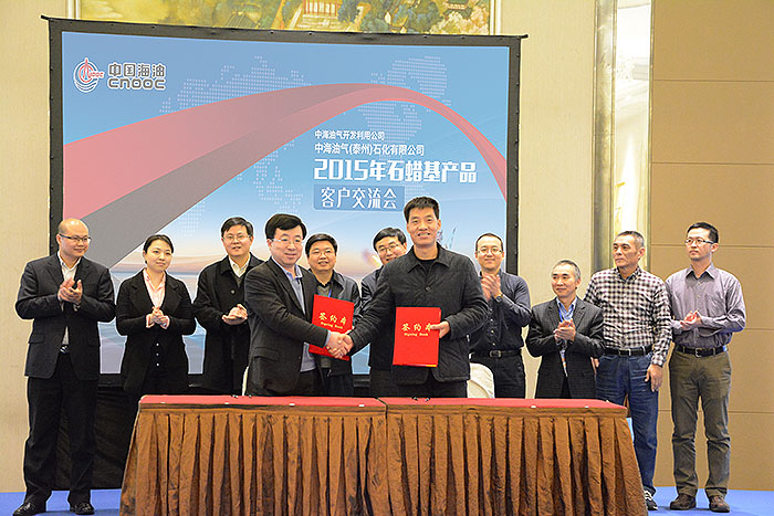 ????????2015年12月16日,中國海洋石油總公司全資二級公司---中海油氣開發(fā)利用公司在南京漢府飯店召開2015年石蠟基產(chǎn)品客戶交流會。應(yīng)中海油氣開發(fā)利用公司總經(jīng)理朱玉明,中海油氣開發(fā)利用公司副總經(jīng)兼中海油氣(泰州)石化有限公司總經(jīng)理夏強斌的邀請,我司董事長林敏、副總經(jīng)理李明及石化部相關(guān)業(yè)務(wù)人員出席交流會。