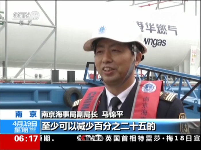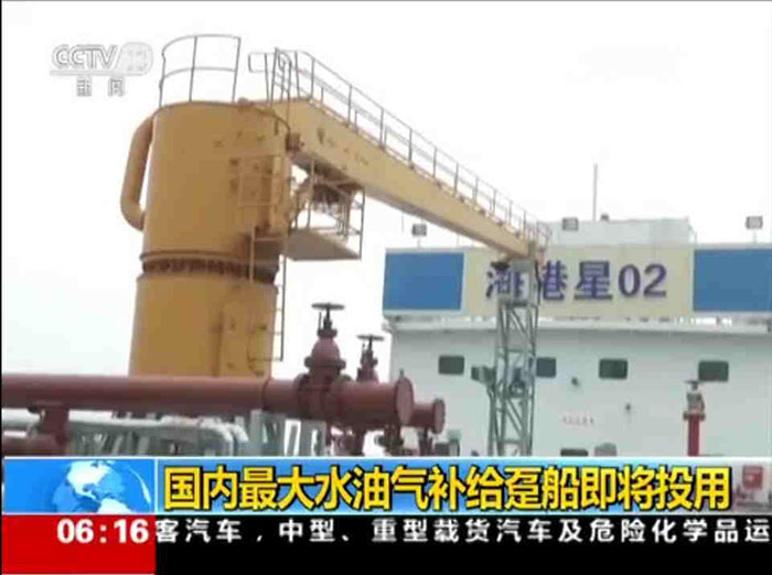 ????????2017年4月19日,中央電視臺(tái)新聞?lì)l道朝聞天下欄目報(bào)道——江蘇海企港華燃?xì)夤煞萦邢薰咀灾鹘ㄔ斓膰鴥?nèi)最大水油氣加注躉船“海港星02”號(hào)即將在江蘇投運(yùn)。“海港星02”號(hào)加注躉船總投資約6100萬元,船長136米,配備2個(gè)250立方米的液化天然氣(LNG)儲(chǔ)罐和可儲(chǔ)存近2000噸柴油的油艙。