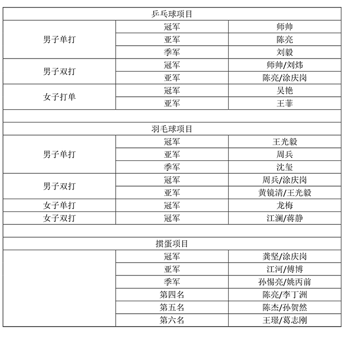????????經(jīng)過(guò)激烈的角逐,在乒乓球、羽毛球、摜蛋3個(gè)大項(xiàng)、8個(gè)小項(xiàng)中共決出冠亞季軍25人次,四五六名6人次,取得了精神文明和運(yùn)動(dòng)成績(jī)雙豐收。具體獲獎(jiǎng)名單如下: